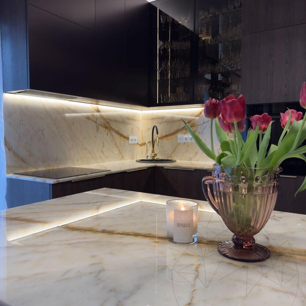 Ideal für den Einsatz in Badezimmern, Küchen, Wohnbereichen und Treppen. Perfekt auch für die Erstellung atemberaubender Arbeitsplatten und Fensterbänke, die jedem Raum einen Hauch von Luxus verleihen.
