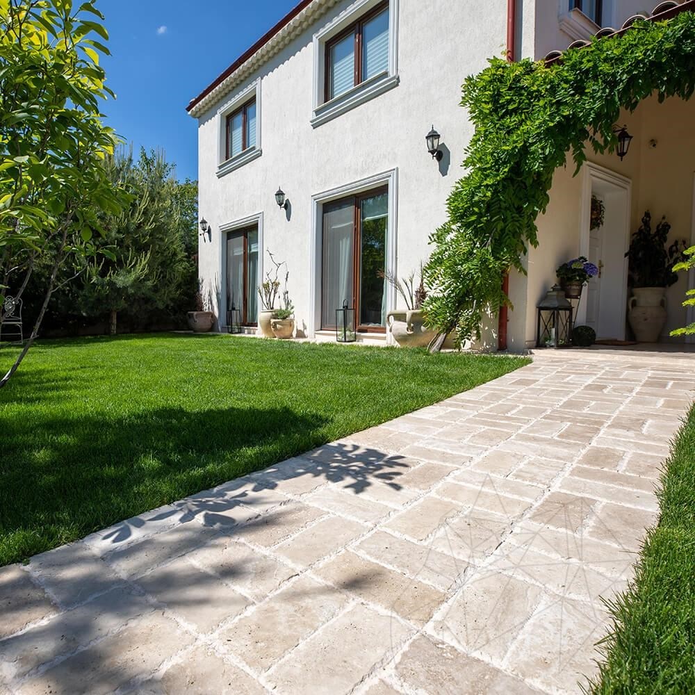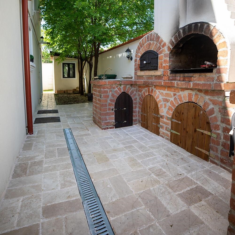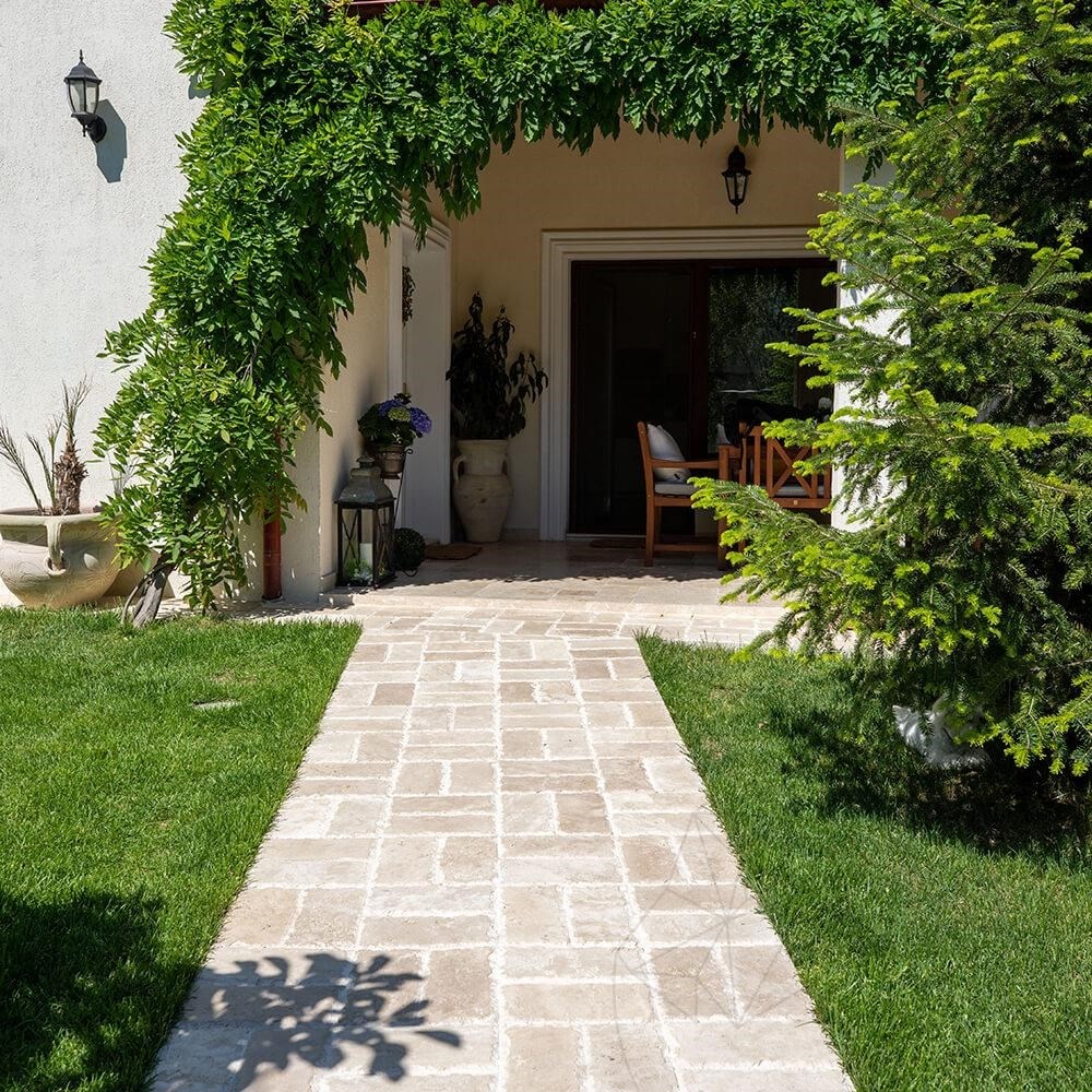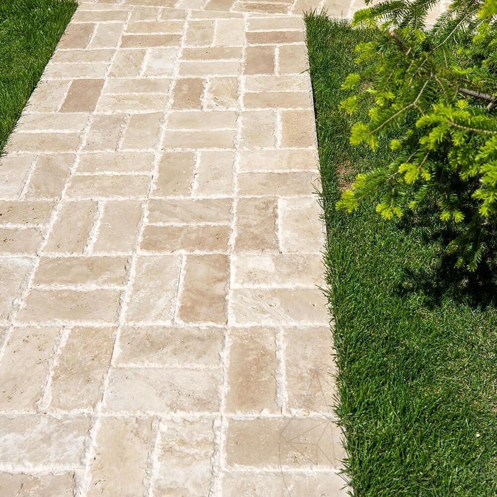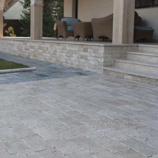 Die Pflasterung aus Naturstein Travertin perfekt für äuβere Parkplätze oder Gehwege. Die Pflasterung aus Travertin Classic ist perfekt geeignet für die Jahreszeiten aus Rumänien. Inland 24/48h -Lieferung .