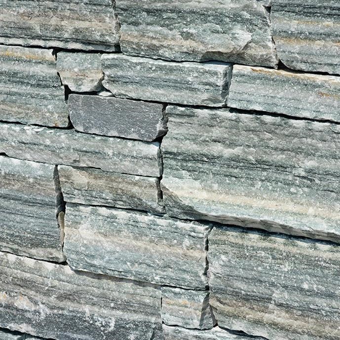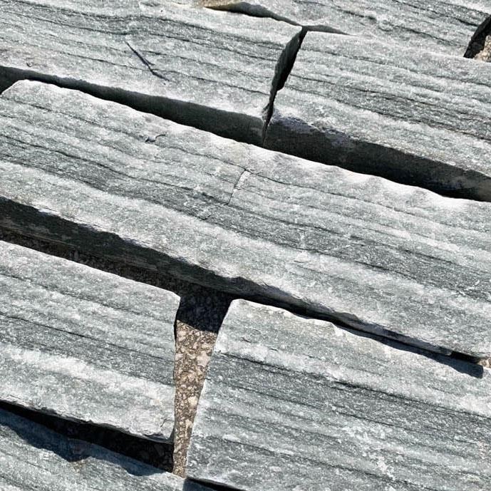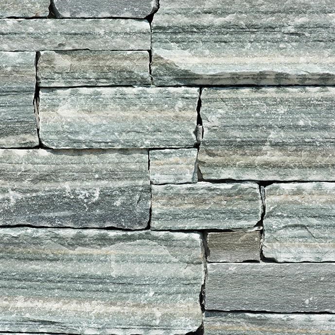 Schiefer ist ein metamorphischer, harter Stein und beständig gegen die Wirkungen einiger physischen großwertigen Faktoren (Temperatur, Druck). Die Druck- und Biegebeständigkeit, die Härte und das gute Verhalten im Vergleich zu der Evolution der klimatische Zyklen, die Varietät Rock Face Flat Olive Green hat eine Olivenfarbe und die Seiten sind so geschnitten, dass sie die Montage erleichtern. Er kann sowohl für vertikale als auch für horizontale Verkleidungen benutzt werden, dank der regelmäßigen geometrischen Formen, die sie haben kann.