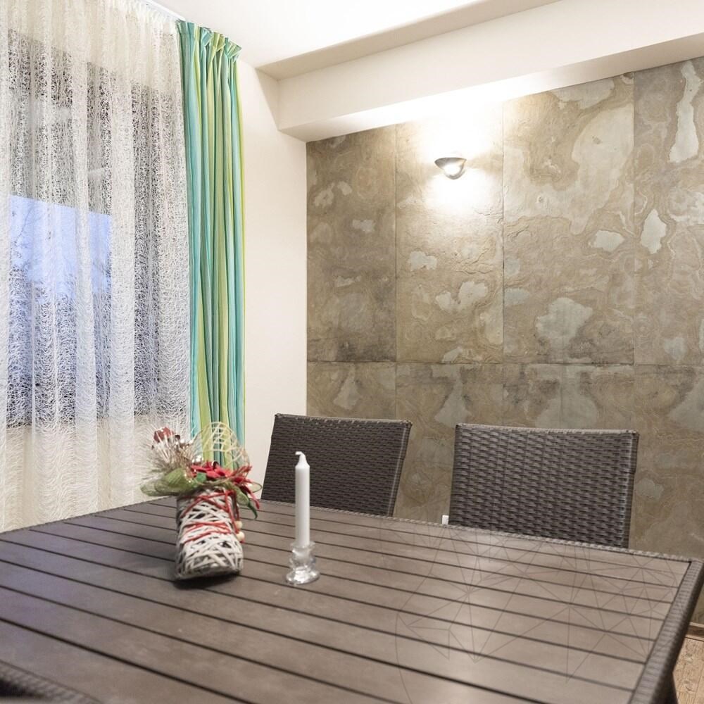 Neben der spezifischen Haltbarkeit von Naturstein besticht die flexible SKIN-Platte durch ihre hohe Flexibilität (1,5–3 mm Dicke) und die Möglichkeit, sie auf nahezu allen Oberflächen, ob rechteckig oder gebogen, zu verlegen. Sie lässt sich mit den in der Holzindustrie üblichen Werkzeugen extrem leicht schneiden. Zu ihren zahlreichen Eigenschaften zählen Stoßfestigkeit, Wasserbeständigkeit, UV-Beständigkeit und ihre Hypoallergenität. Wie bei jedem Natursteinprodukt muss die Oberfläche regelmäßig mit professionellen, von Experten empfohlenen Versiegelungslösungen versiegelt werden.
