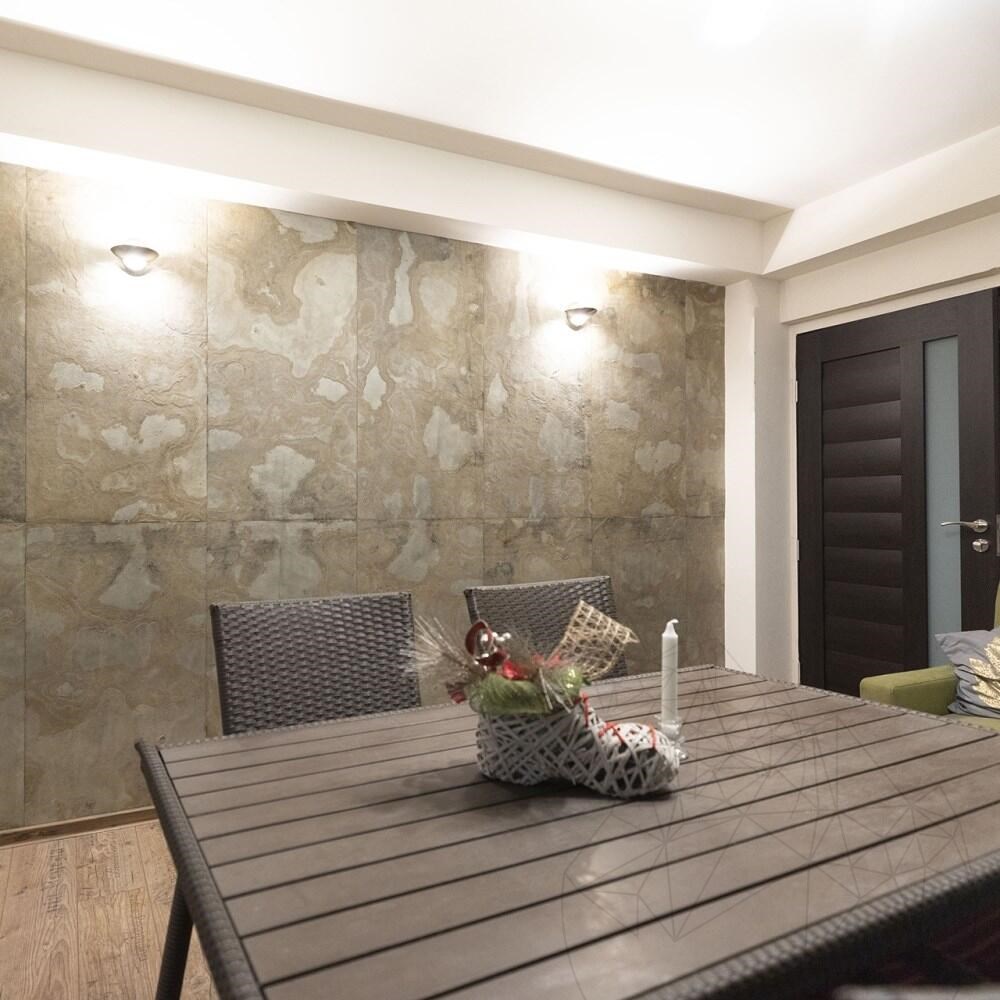Anwendung : Alle SKIN-Flexschieferplatten von PIATRAONLINE können ohne Bewehrung für Außenverkleidungen verwendet werden. Dank ihres Gewichts von 1–2 kg/m² und ihrer Dicke von 1,5–3 mm sind die Einsatzmöglichkeiten nahezu unbegrenzt. Sie sind UV- und wasserbeständig (für Saunen, Badezimmer, Keller). SKIN-Flexschiefer lässt sich problemlos auf Möbeln oder Haustüren anbringen. Zur Montage können Sie jeden beliebigen Polyurethankleber verwenden oder Außenverkleidungen direkt mit Keramikfliesen verlegen. Die Dicke von 1,5–3 cm erhöht die Stoßfestigkeit.