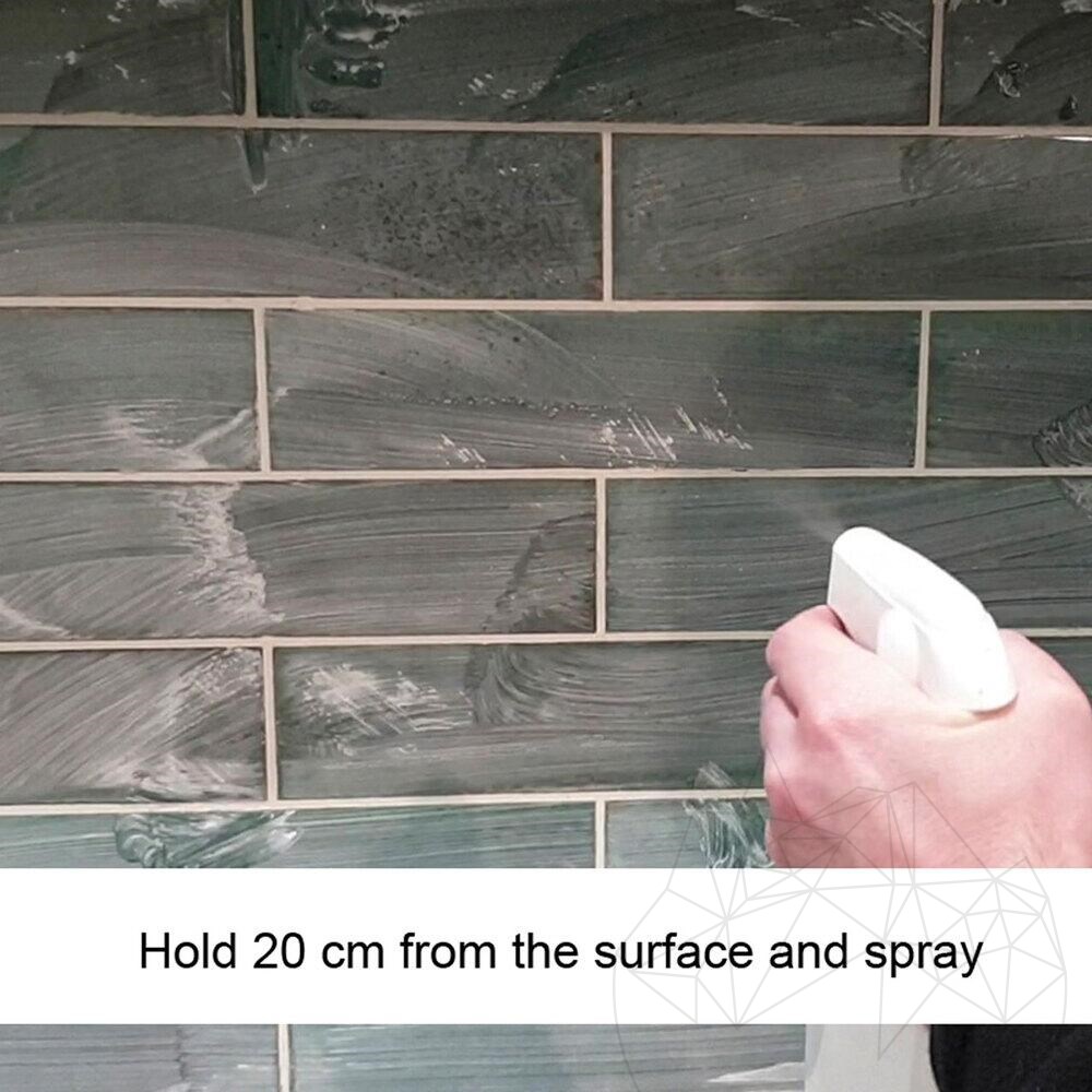 - Fugenschleierreste: Auf die betroffene Fläche sprühen und mit einem Mikrofaser-Tuch abwischen. Bei hartnäckigen Flecken einen Schwamm mit Griff verwenden.