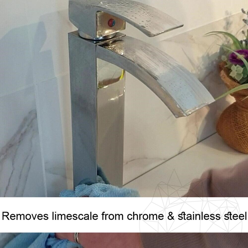 - Kalkrückstände: Sprühen und mit einem Schwamm mit Griff schrubben, dann mit einem Mikrofaser-Tuch abwischen.