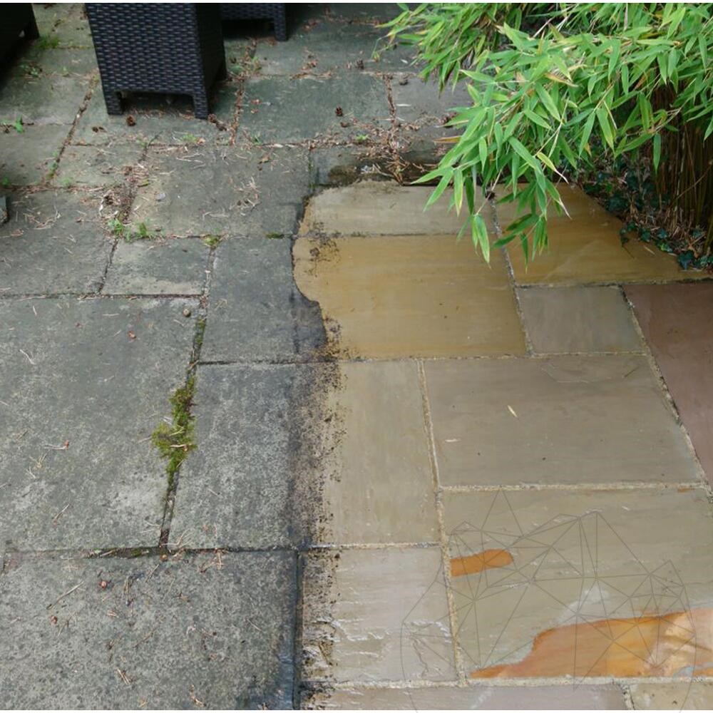 Reinigen Sie zuerst die Oberfläche und entfernen Sie Spuren von Blättern, Ästen, Staub, Resten und Gartenmöbeln. Durch Sprühen direkt auf die Oberfläche auftragen. Lassen Sie es für 2-4 Stunden reagieren. Das Produkt beginnt zu sprudeln, wenn es zur Arbeit kommt. Reinigen Sie die Oberfläche nach dem Auftragen der Lösung immer mit kaltem Wasser.