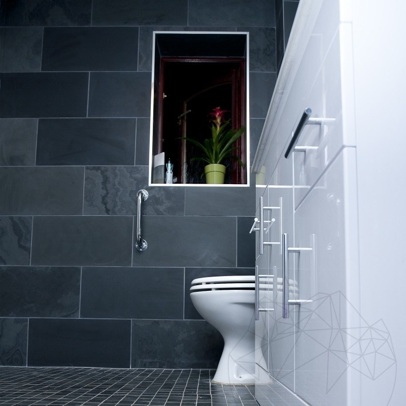 Die schwarze Farbe bietet dem Raum Persönlichkeit und obwohl es schwer vorstellbar ist, ist es sehr leicht mit anderen natürlichen Elementen und Nuancen zu mischen. Nero gebürsteter Schiefer bringt ein Plus dem Raum, da es der härteste Schiefer ist, und auch gegen Temperaturschwankungen ein hohes Widerstand hat.