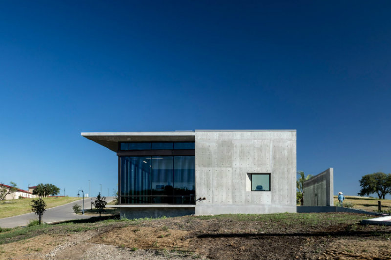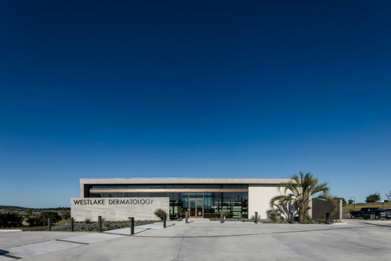 Einen ungewöhnlichen Entwurf haben die Amerikaner vom Büro Matt Fajkus Architecture für eine dermatologische Klinik in Marble Falls, Texas, gewählt. Wenn sich der graue Beton von außen durch seine Farbgebung perfekt in die Landschaft einfügt, stellt die schlichte Form einen Anziehungspunkt in Bezug auf den Klinikhügel dar. Die schlichte Lösung für rechteckige Formen und keine unterschiedlichen Volumen erweist sich jedoch als sehr inspirierend, da eine Straße vor dem Gebäude vorbeiführt.