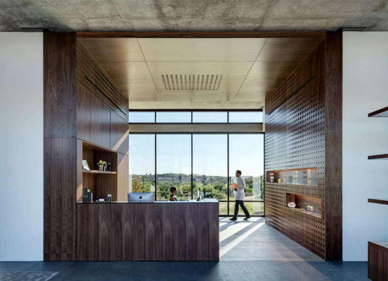 Die einfache Farbe und Geometrie des Gebäudes harmoniert perfekt mit der flachen und grauen Straße, die nach Austin führt. Wenn die äußere Schlichtheit und Subtilität der Formen die Persönlichkeit des Gebäudes bestimmen, sind die Dinge in der Innenausstattung genau umgekehrt. Die Umgebung mit fast 3.000 Quadratmetern setzt auf die Behaglichkeit von Holz und Naturstein. Die Verkleidung aus Naturstein vermittelt den Patienten der Klinik ein Gefühl von Komfort und Sicherheit. Diese Klinik hat nichts mit dem typischen Bild solcher Kliniken zu tun.
