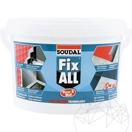 Der Klebstoff Soudal FIX ALL Floor and Wall (Boden und Wand) gehört zu der FIX ALL - Familie und beinhaltet alle dessen Eigenschaften. Es ist ein Produkt auf Polymerbasis, neutral und elastisch. Dieser gehört zur Kategorie der Universalklebstoffe, klebt auf fast jede Oberfläche. Dieser hat die Konsistenz einer Paste und bildet den Film in ungefähr 25 Minuten. Dieser hat eine Trocknungszeit von 24 Stunden, für eine 3 mm Schicht. Dieser ist beständig gegen Wasser, Fette, Mineralöle , bestimmte Lösungsmittel und verdünnte Säuren. Dieser ist empfindlich gegenüber aromatischen Lösungsmitteln (Benzol, Toluol, Xylol usw.), starken Säuren und chlorierten Kohlenwasserstoffen (industrielles Lösungsmittel Trichlorethylen, Chloroform, Dichlorodiphenyltrichloroethane -Insektizid, Heptachlor usw.).