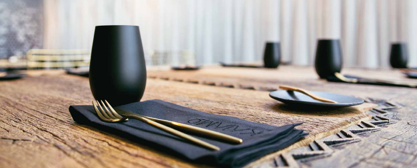 Mostly handled by Radu Ionescu, the interior design is defined by minimalistic elements, plus ancient wood with golden glitters here and there. Furniture and accessories have been refurbished with ancient wood elements from every region of Romania, and the wood was refurbished with craftsmen in wood. The tables and lounge sofa were made from oak wood, crafted by Sibiu craft masters and the bar was rebuilt with wood that served as an actual inn flooring. The entrance mask also serves as the restaurant’s logo. Typical of the Maramures region and a symbol of change, plus transition from one stage to another, and serving as a protection element against negative vibes.
