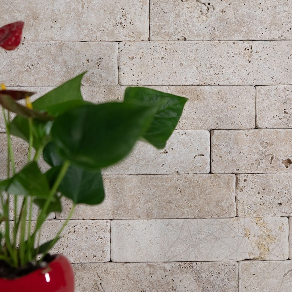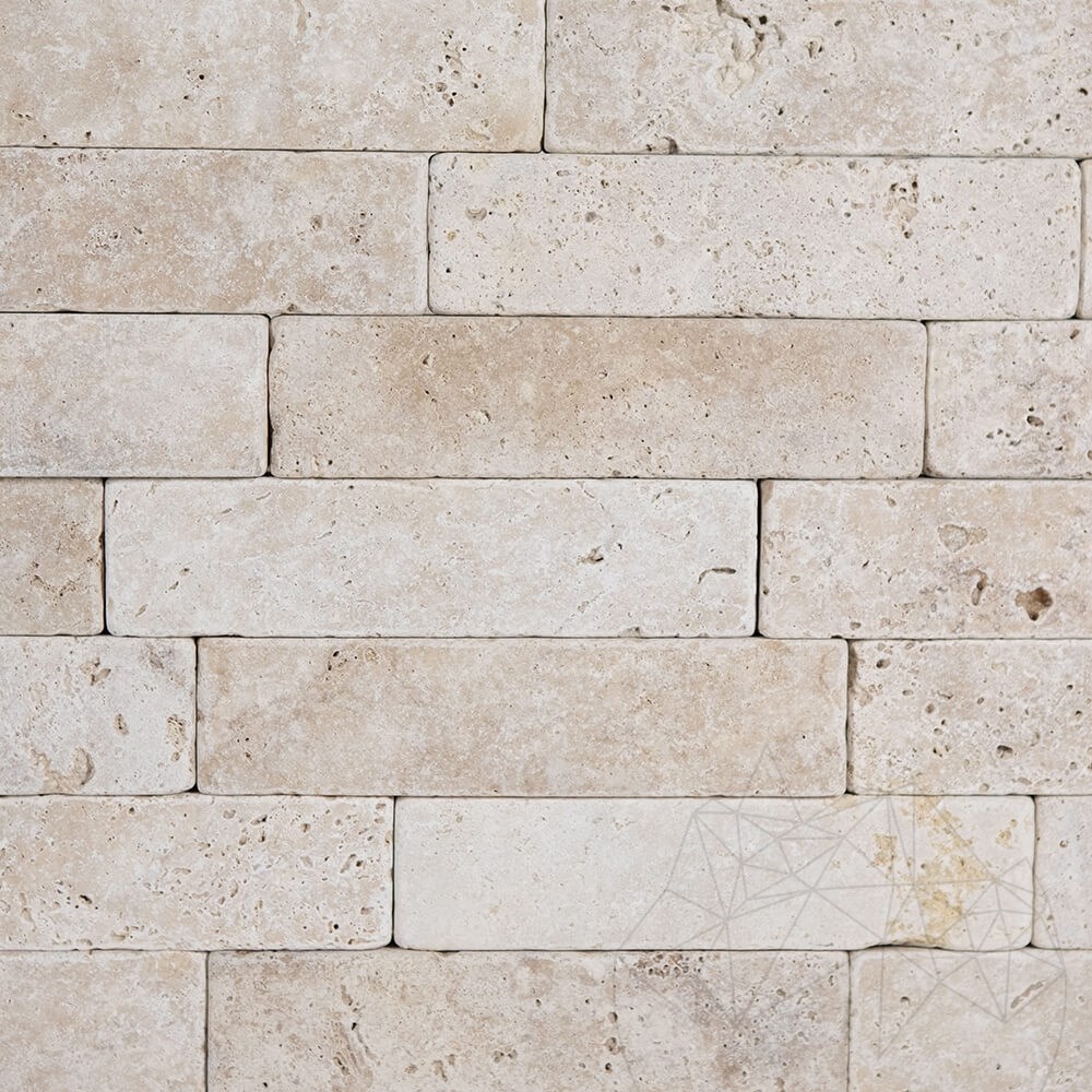 Klassische Tumbled Brick Travertine ist ein dekoratives Element, das an Zärtlichkeit erinnert, im Gegensatz zu der rauen und harten Optik von Naturstein. Ein aus der Türkei importierter Stein, Classic Tumbled Brick Travertin, wird für die Verkleidung empfohlen, sowohl innen als auch außen.