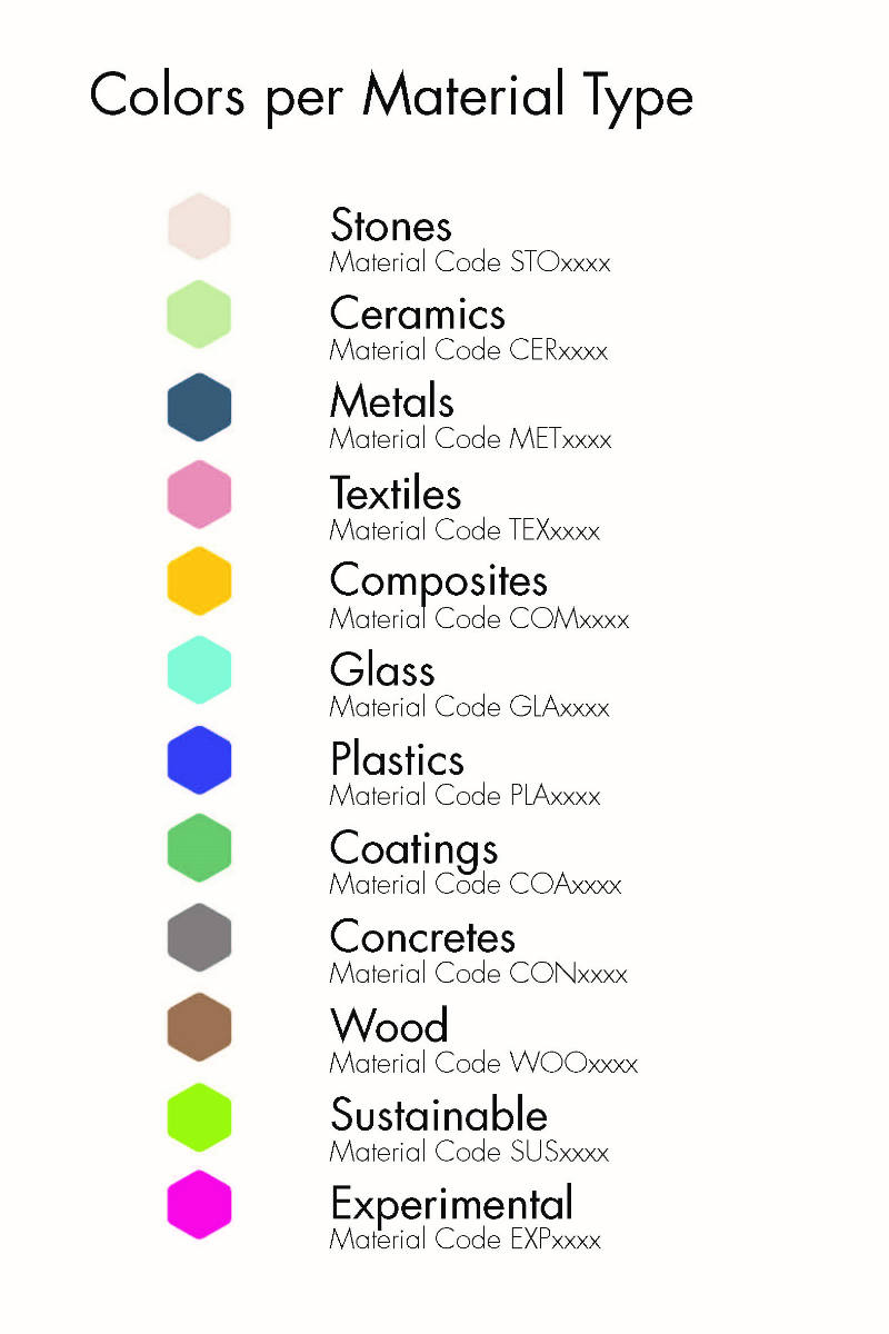 Die Kategorien, in denen sie verteilt werden, sind so gewählt, dass sie leicht indiziert und von jedem gefunden werden können: Holz, Stein, Beton, Textilien, Glas, natürliche Verbundmaterialien usw.