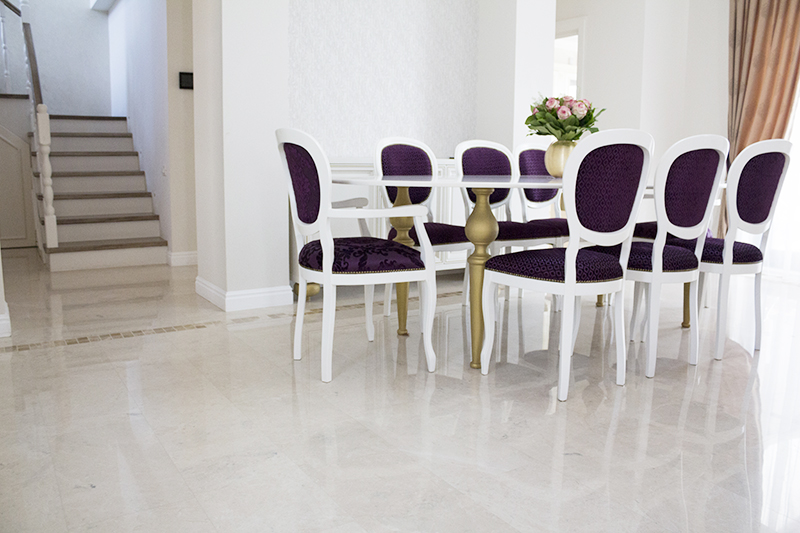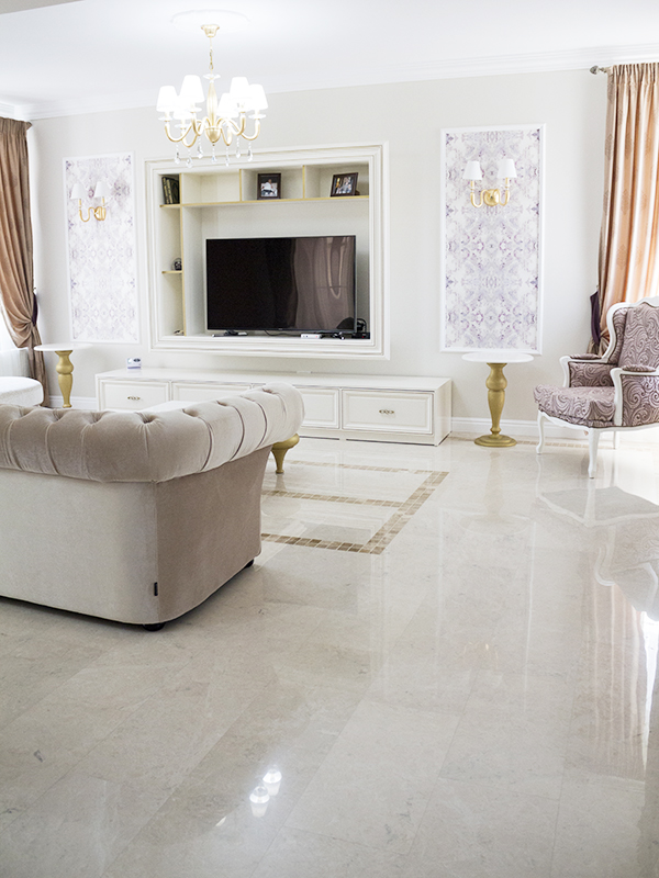 Die polierte Oberfläche trägt dazu bei, die Platten perfekt abzudichten und macht sie langlebiger, verbessert aber auch die Quantität und Qualität des Lichts im Raum. Besonders dieses Wohnzimmer bekommt viel Sonnenlicht, was die natürliche Schönheit des Marmors hervorhebt.