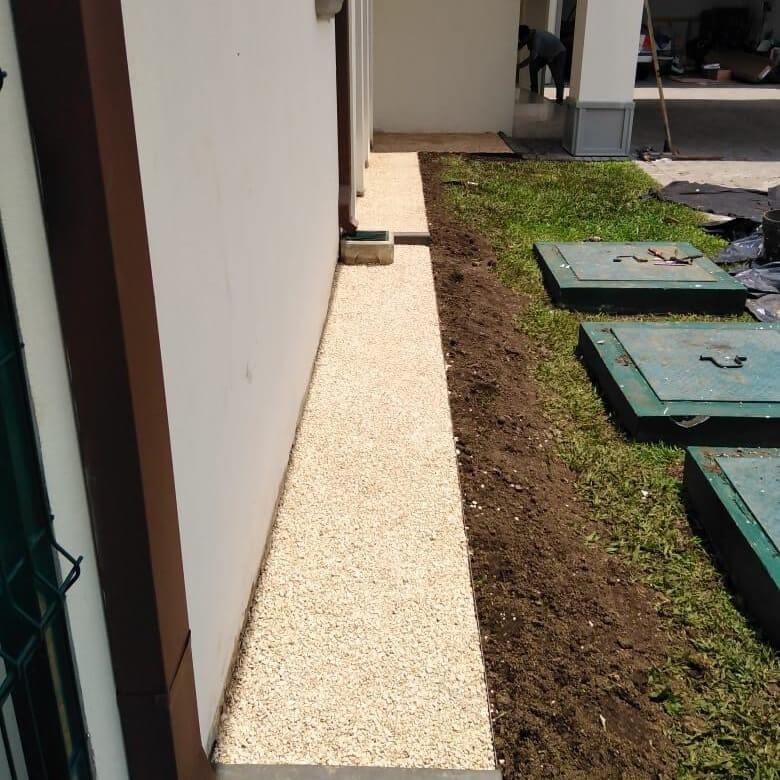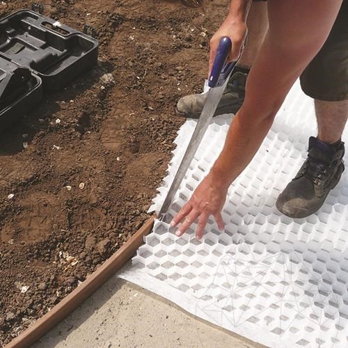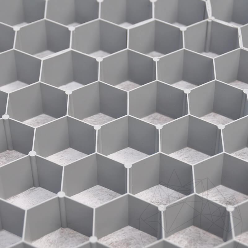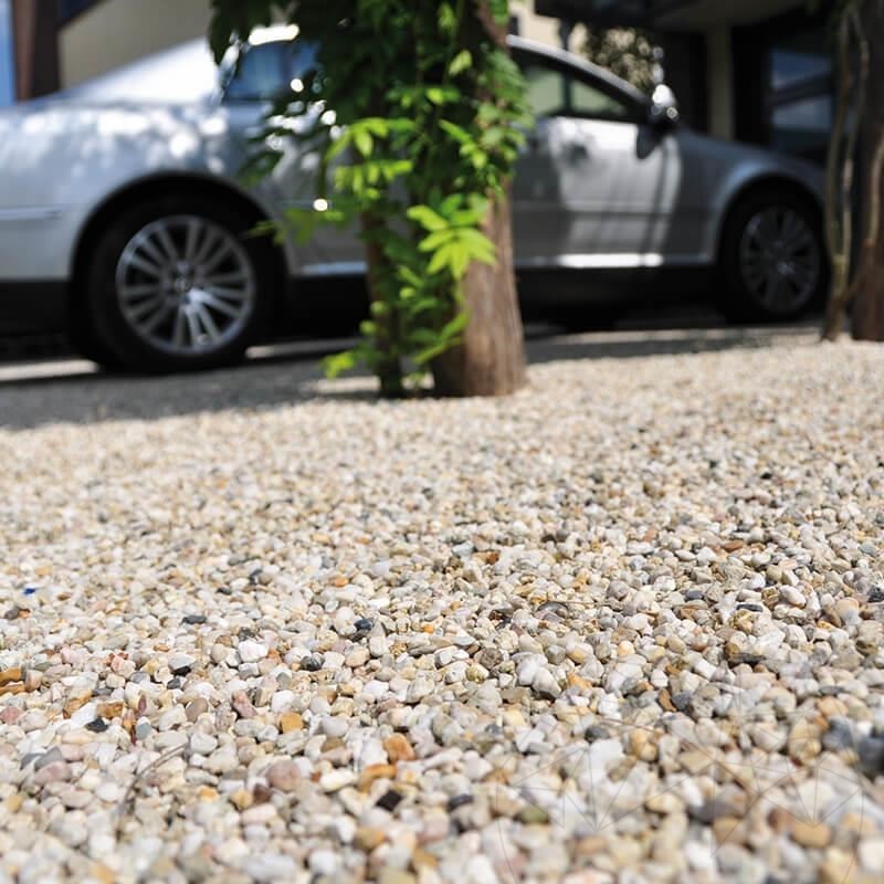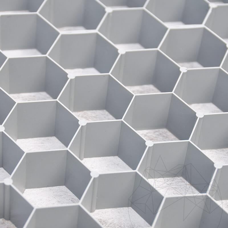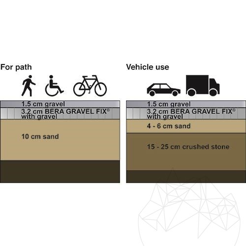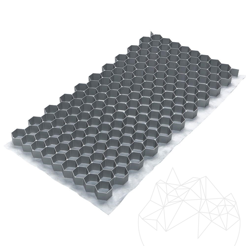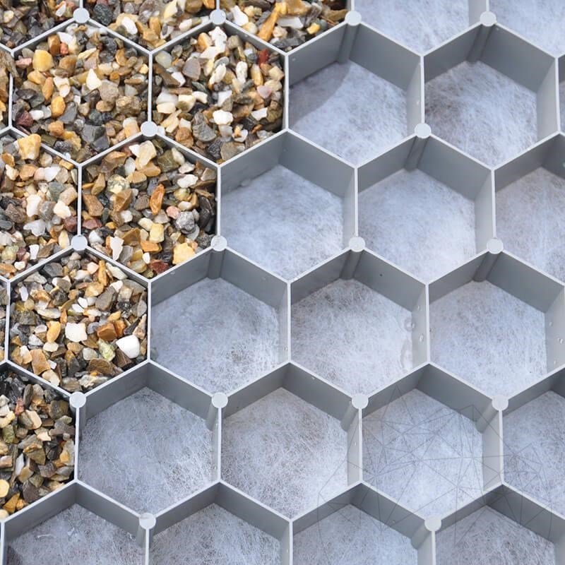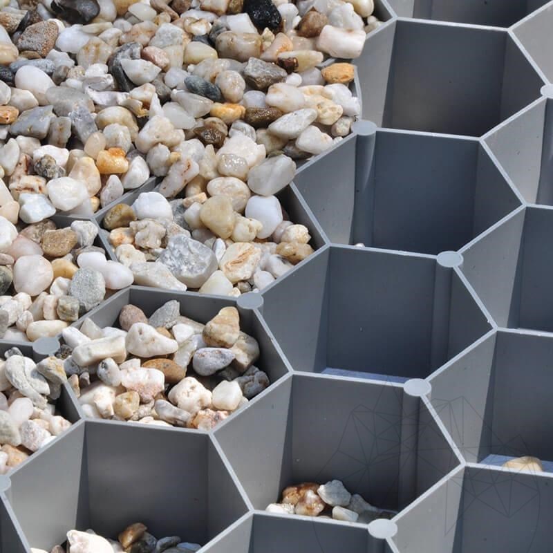 von Kies und Splitt. Ebenfalls kann es zur Befestigung von Sand u. Erde verwendet werden. Durch die stabilisierende Wirkung der Wabenstruktur entsteht eine feste, jedoch wasserdurchlässige Oberfläche, welche ausgezeichnet begeh- und befahrbar ist.